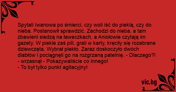 Spytali Iwanowa po śmierci, czy woli iść do pieklą, czy do nieba. Postanowił sprawdzić. Zachodzi do nieba, a tam zbawieni siedzą na ławeczkach, a Aniołowie czytają im gazety. W piekle zaś pili, grali w karty, kręciły się rozebrane dziewczęta. Wybrał piekło. Zaraz doskoczyło dwóch diabłów i pociągnęli go na rozgrzaną patelnię. - Dlaczego?! - wrzasnął - Pokazywaliście co innego!