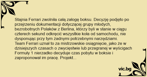 Stajnia Ferrari zwolniła całą załogę boksu. Decyzję podjęto po przejrzeniu dokumentacji dotyczącej grupy młodych, bezrobotnych Polaków z Berlina, którzy byli w stanie w ciągu czterech sekund odkręcić wszystkie koła od samochodu, nie dysponując przy tym żadnymi potrzebnymi narzędziami.