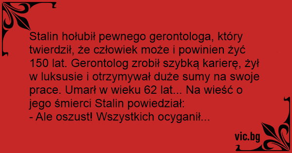 Stalin hołubił pewnego gerontologa, który twierdził, że człowiek może i powinien żyć 150 lat. Gerontolog zrobił szybką karierę, żył w luksusie i otrzymywał duże sumy na swoje prace. Umarł w wieku 62 lat... Na wieść o jego śmierci Stalin powiedział: