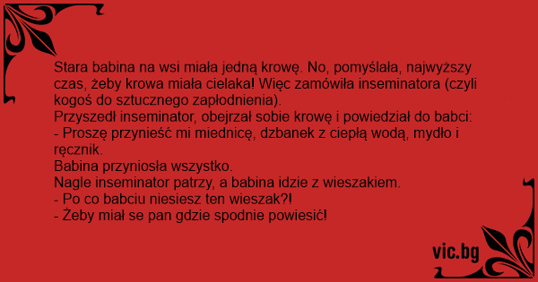Stara babina na wsi miała jedną krowę. No, pomyślała, najwyższy czas, żeby krowa miała cielaka! Więc zamówiła inseminatora (czyli kogoś do sztucznego zapłodnienia).