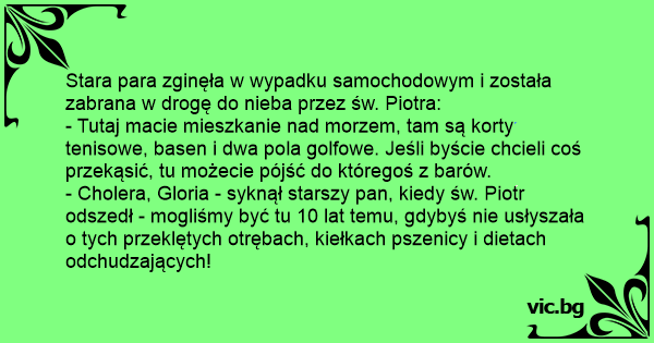 - Сhоlеrа, Gloria - syknął starszy pan, kiedy św. Piotr odszedł - mogliśmy być tu 10 lat temu, gdybyś nie usłyszała o tych przeklętych otrębach, kiełkach pszenicy i dietach odchudzających!