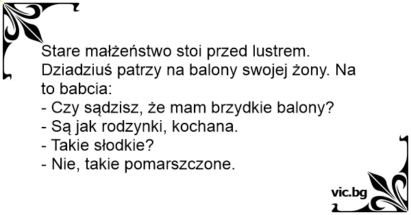 Stare małżeństwo stoi przed lustrem. Dziadziuś patrzy na balony swojej żony. Na to babcia: