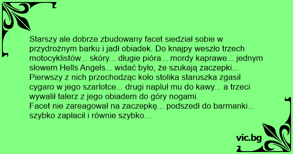 Starszy ale dobrze zbudowany facet siedział sobie w przydrożnym barku i jadł obiadek. Do knajpy weszło trzech motocyklistów... skóry... długie pióra... mordy kaprawe... jednym słowem Hells Angels... widać było, że szukają zaczepki... Pierwszy z nich przechodząc koło stolika staruszka zgasił cygaro w jego szarlotce... drugi napluł mu do kawy... a trzeci wywalił talerz z jego obiadem do góry nogami.