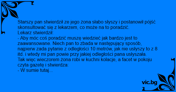 Starszy pan stwierdził ze jego żona słabo słyszy i postanowił pójść skonsultować się z lekarzem, co może na to poradzić.