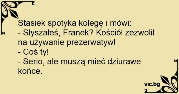 - Słyszałeś, Franek? Kościół zezwolił na używanie prezerwatyw!