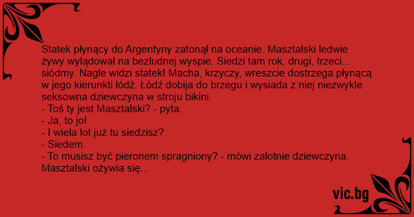 Statek płynący do Argentyny zatonął na oceanie. Masztalski ledwie żywy wylądował na bezludnej wyspie. Siedzi tam rok, drugi, trzeci... siódmy. Nagle widzi statek! Macha, krzyczy, wreszcie dostrzega płynącą w jego kierunkti łódź. Łódź dobija do brzegu i wysiada z niej niezwykle seksowna dziewczyna w stroju bikini.