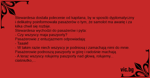 Ανακοίνωση αεροσυνοδού λίγο πριν την πτήση: - Κυρίες και κύριοι, δεθείτε καλά και σας διαβεβαιώνουμε ότι θα κάνουμε ότι μπορούμε για να έχετε ευχάριστο ταξίδι. Πάντως βάλτε το διαβατήριό σας ο...