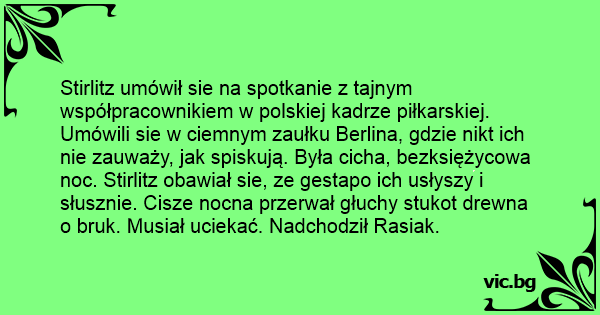 Stirlitz umówił sie na spotkanie z tajnym współpracownikiem w polskiej kadrze piłkarskiej. Umówili sie w ciemnym zaułku Berlina, gdzie nikt ich nie zauważy, jak spiskują. Była cicha, bezksiężycowa noc. Stirlitz obawiał sie, ze gestapo ich usłyszy i słusznie. Cisze nocna przerwał głuchy stukot drewna o bruk. Musiał uciekać. Nadchodził Rasiak.