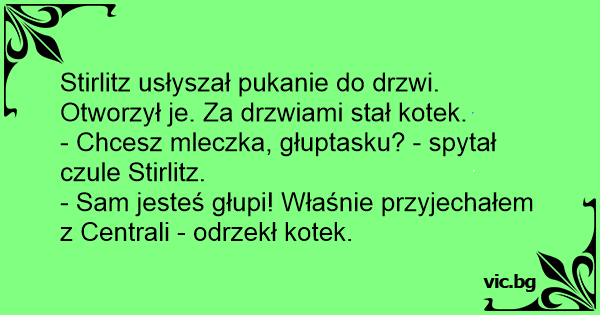 Stirlitz usłyszał pukanie do drzwi. Otworzył je. Za drzwiami stał kotek.