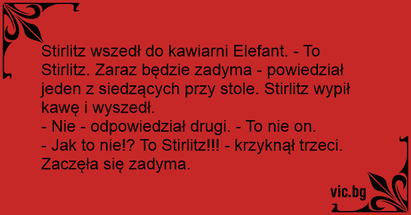 Stirlitz wszedł do kawiarni Elefant. - To Stirlitz. Zaraz będzie zadyma - powiedział jeden z siedzących przy stole. Stirlitz wypił kawę i wyszedł.