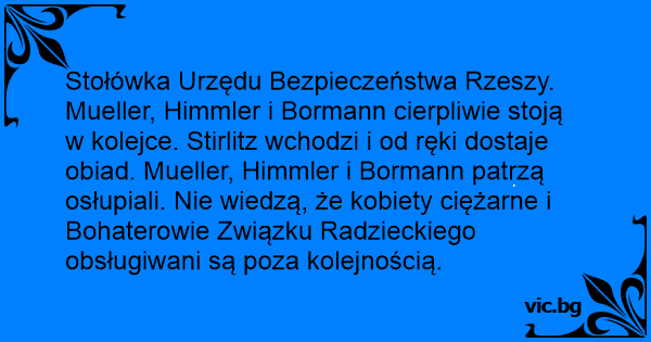 Stołówka Urzędu Bezpieczeństwa Rzeszy. Mueller, Himmler i Bormann cierpliwie stoją w kolejce. Stirlitz wchodzi i od ręki dostaje obiad. Mueller, Himmler i Bormann patrzą osłupiali. Nie wiedzą, że kobiety ciężarne i Bohaterowie Związku Radzieckiego obsługiwani są poza kolejnością.