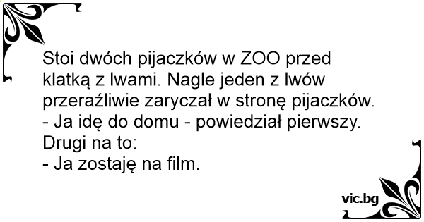 Stoi dwóch pijaczków w ZOO przed klatką z lwami. Nagle jeden z lwów przeraźliwie zaryczał w stronę pijaczków.