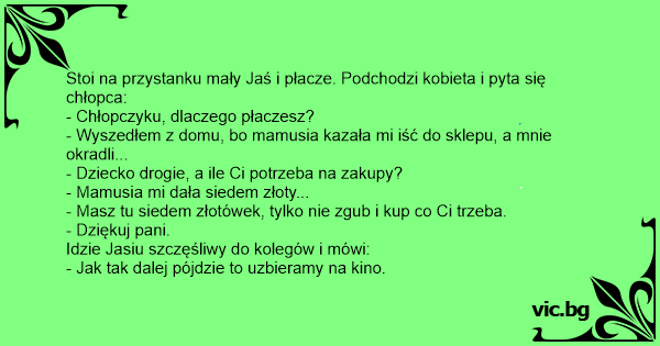 Stoi na przystanku mały Jaś i płacze. Podchodzi kobieta i pyta się chłopca:
