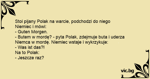 - Butem w mordę? - pyta Polak, zdejmuje buta i uderza