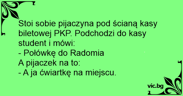 Stoi sobie pijaczyna pod ścianą kasy biletowej PKP. Podchodzi do kasy student i mówi: