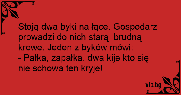 Stoją dwa byki na łące. Gospodarz prowadzi do nich starą, brudną krowę. Jeden z byków mówi: