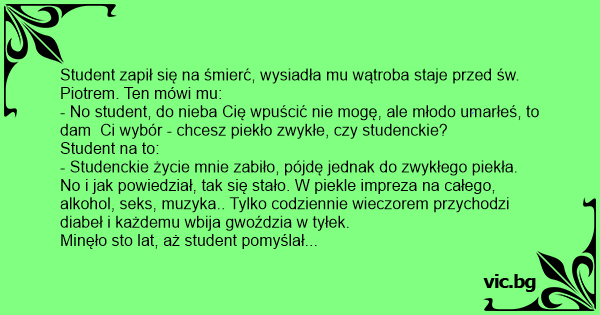 - No student, do nieba Cię wpuścić nie mogę, ale młodo umarłeś, to dam Ci wybór - chcesz piekło zwykłe, czy studenckie?
