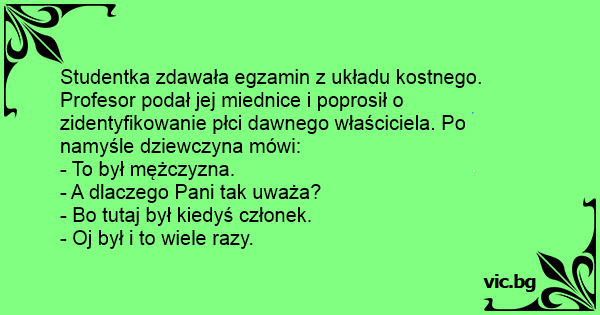 Studentka zdawała egzamin z układu kostnego. Profesor podał jej miednice i poprosił o zidentyfikowanie płci dawnego właściciela. Po namyśle dziewczyna mówi: