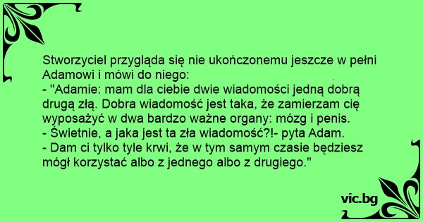 Adam's New Organs Kommt der Erzengel zu Adam und sagt: Бог дал на мъжете мозък и пенис, но кръвта е само толкова, че по едно и също време може да се използва само единият орган. Dios llama a Adán y le dice: Един ден Господ отишъл при Адам и му казал: God said to Adam, "I’ve got some good news and some bad news. God gave man his penis and his brain but blood only enough to work one another at a time. Dieu dit à Adam, "J'ai une bonne et une mauvaise nouvelle pour toi Adam, laquelle veux-tu connaître en premier ?" Adam dit, "Dites-moi la bonne d'abord." Dieu dit, "Je vais te donner un pénis et un... Dios le dice a Adán: - Debo darte dos noticias, una buena y la otra mala. - Primero la buena, señor! –dice Adán - Te daré dos regalos: un cerebro y un pene. - Genial! Y la mala? - No puedes... Den ena tjejen till den andra: - Gud utrustade mannen med hjärna och snopp, men utan tillräckligt med blod för att hålla bägge igång samtidigt. Um dia, no Paraíso, Deus chegou para Adão e falou: — Adão, eu tenho boas e más notícias para você, meu filho. Quais você quer ouvir primeiro? — As boas notícias, senhor — responde Adão. Deus sorri... Intr-o zi, Dumnezeu il cheama pe Adam si-i spune: - Am sa-ti dau doua vesti: una buna si una rea. Cu care sa incep? - Pai, spune-o pe aia buna, zice Adam. - Am doua organe noi pentru tine, spune... Isten így szól Ádámhoz : - Van egy jó és egy rossz hírem Számodra. - Előbb a jót mond - feleli Ádám. - Kapsz tőlem két ajándékot: agyat és Farkat. - Remek, és mi a rossz hír? - Nincs elég véred... Ο Θεός έδωσε στον άντρα εγκέφαλο και γενετικά όργανα, αλλά όχι αρκετό αίμα για να τροφοδοτήσει και τα δύο ταυτόχρονα.