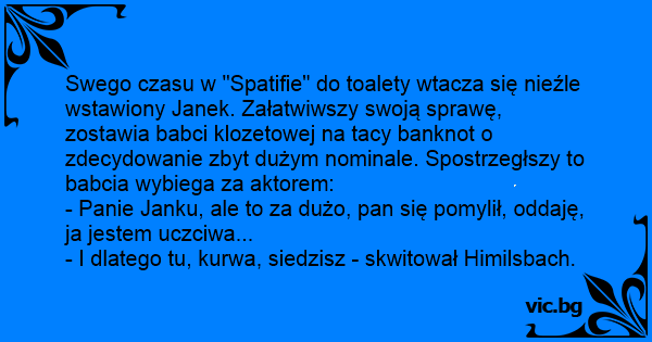 Swego czasu w "Spatifie" do toalety wtacza się nieźle wstawiony Janek. Załatwiwszy swoją sprawę, zostawia babci klozetowej na tacy banknot o zdecydowanie zbyt dużym nominale. Spostrzegłszy to babcia wybiega za aktorem: