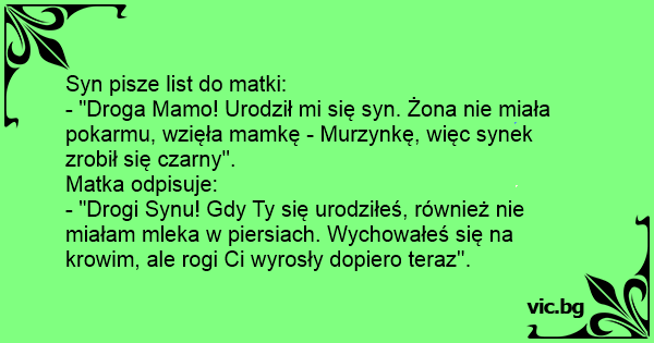 - "Droga Mamo! Urodził mi się syn. Żona nie miała pokarmu, wzięła mamkę - Murzynkę, więc synek zrobił się czarny''.