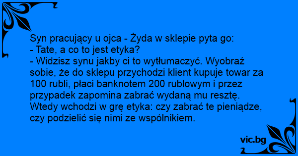 - Widzisz synu jakby ci to wytłumaczyć. Wyobraź sobie, że do sklepu przychodzi klient kupuje towar za 100 rubli, płaci banknotem 200 rublowym i przez przypadek zapomina zabrać wydaną mu resztę. Wtedy wchodzi w grę etyka: czy zabrać te pieniądze, czy podzielić się nimi ze wspólnikiem.