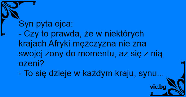 Синот го прашува таткото: Вистина ли е дека во некои области на Африка мажот не ја познава жената сè додека не ја ожени? Таткото: Така ти е тоа, сине мој, во сите земји.