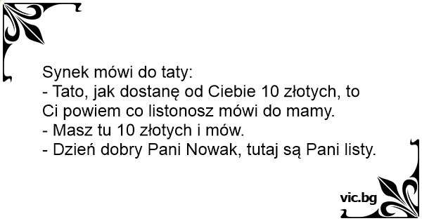 - Tato, jak dostanę od Ciebie 10 złotych, to Ci powiem co listonosz mówi do mamy.