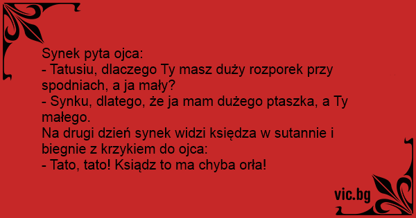 - Synku, dlatego, że ja mam dużego ptaszka, a Ty małego.