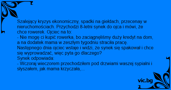 Szalejący kryzys ekonomiczny, spadki na giełdach, przecenay w nieruchomościach. Przychodzi 8-letni synek do ojca i mówi, że chce rowerek. Ojciec na to: