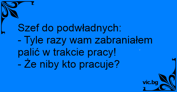 Szef wchodzi do pomieszczenia i przedzierając się przez kłęby dymu, wrzeszczy: - Ile razy mówiłem, żeby nie palić w pracy?! Na co jeden z pracowników, plując na podłogę: - A kto tu pracuje?