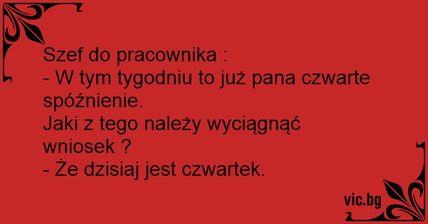 Boss padotajam: - Jūs jau piekto dienu pēc kārtas kavējat darbu!Kādi secinājumi,pēc jūsu domām,man būtu jāizdara? - Ka šodien piektdiena!