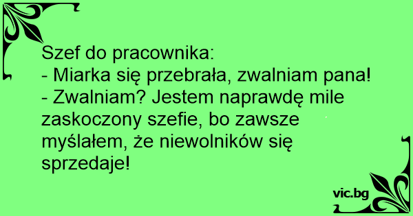 - Zwalniam? Jestem naprawdę mile zaskoczony szefie, bo zawsze myślałem, że niewolników się sprzedaje!
