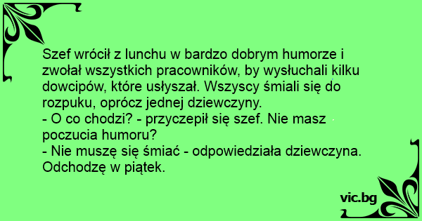 Szef wrócił z lunchu w bardzo dobrym humorze i zwołał wszystkich pracowników, by wysłuchali kilku dowcipów, które usłyszał. Wszyscy śmiali się do rozpuku, oprócz jednej dziewczyny.