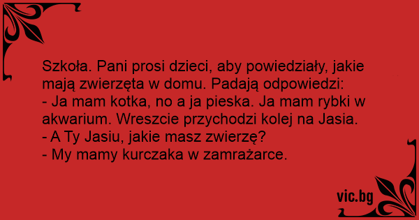 Szkoła. Pani prosi dzieci, aby powiedziały, jakie mają zwierzęta w domu. Padają odpowiedzi: