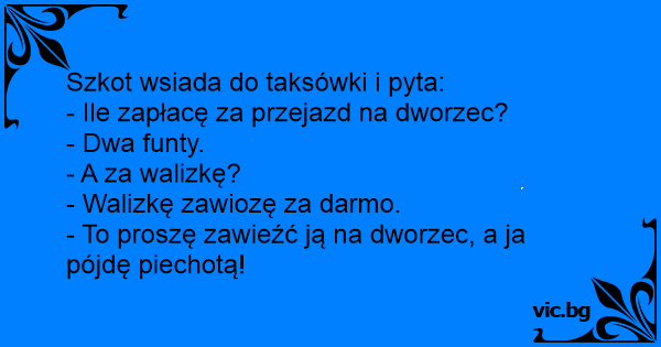 - Vad kostar det ned till centralstationen, frågade en skotte som var på besök i Göteborg taxichauffören. - Ungefär hundrafemtio kronor... - Och vad tar ni då för att ta med min resväska? - Det...