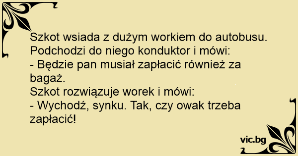 Szkot wsiada z dużym workiem do autobusu. Podchodzi do niego konduktor i mówi: