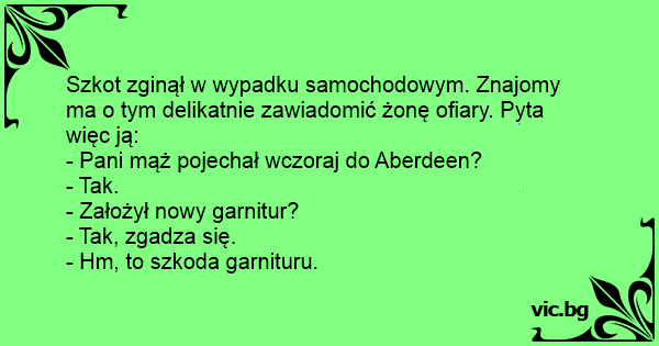 Szkot zginął w wypadku samochodowym. Znajomy ma o tym delikatnie zawiadomić żonę ofiary. Pyta więc ją: