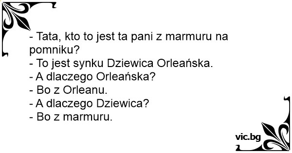 - Тате, коя е мраморната дама на паметника? - Това е Орлеанската Дева, сине. - А защо Орлеанска? - Защото е от Орлеан. - А защо дева? - Защото е от мрамор.