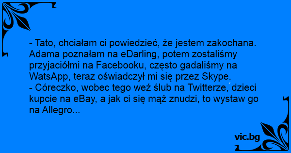 - Córeczko, wobec tego weź ślub na Twitterze, dzieci kupcie na eBay, a jak ci się mąż znudzi, to wystaw go na Allegro...