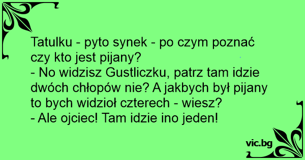 - No widzisz Gustliczku, patrz tam idzie dwóch chłopów nie? A jakbych był pijany to bych widzioł czterech - wiesz?