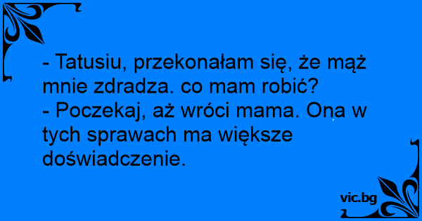- Тате, разбрах, че съпругът ми ми изневерява. Какво трябва да направя? - Изчакай майка ти да се прибере. Тя има повече опит с тези въпроси.
