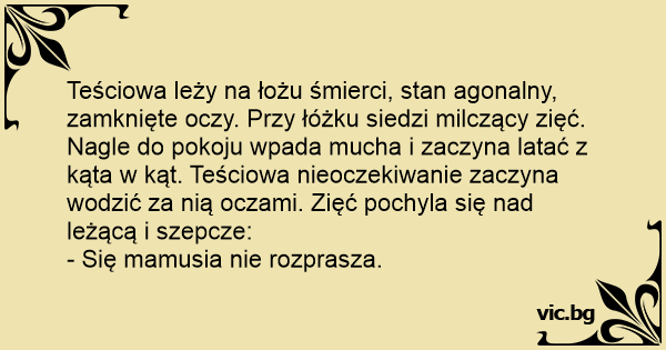 Teściowa leży na łożu śmierci, stan agonalny, zamknięte oczy. Przy łóżku siedzi milczący zięć. Nagle do pokoju wpada mucha i zaczyna latać z kąta w kąt. Teściowa nieoczekiwanie zaczyna wodzić za nią oczami. Zięć pochyla się nаd leżącą i szepcze: