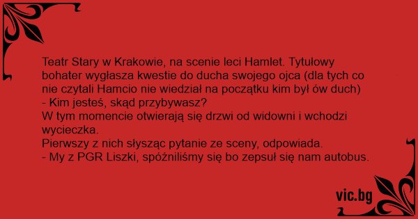 Teatr Stary w Krakowie, na scenie leci Hamlet. Tytułowy bohater wygłasza kwestie do ducha swojego ojca (dla tych co nie czytali Hamcio nie wiedział na początku kim był ów duch)