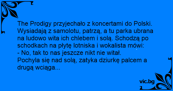 The Prodigy przyjechało z koncertami do Polski. Wysiadają z samolotu, patrzą, a tu parka ubrana na ludowo wita ich chlebem i solą. Schodzą po schodkach na płytę lotniska i wokalista mówi:
