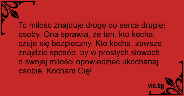 To miłość znajduje drogę do serca drugiej osoby. Ona sprawia, że ten, kto kocha, czuje się bezpieczny. Kto kocha, zawsze znajdzie sposób, by w prostych słowach o swojej miłości opowiedzieć ukochanej osobie. Kocham Cię!
