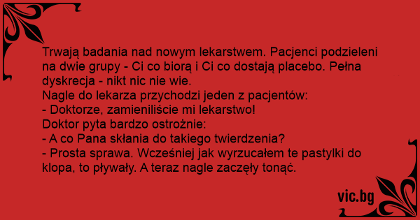 Trwają badania nаd nowym lekarstwem. Pacjenci podzieleni na dwie grupy - Ci co biorą i Ci co dostają placebo. Pełna dyskrecja - nikt nic nie wie.