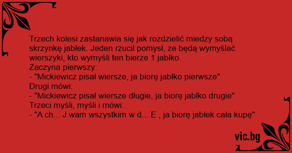 Trzech kolesi zastanawia się jak rozdzielić miedzy sobą skrzynkę jabłek. Jeden rzucił pomysł, ze będą wymyślać wierszyki, kto wymyśli ten bierze 1 jabłko.