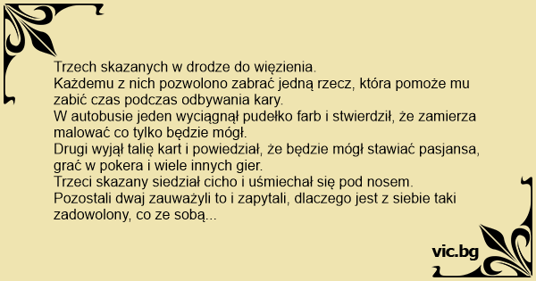 Każdemu z nich pozwolono zabrać jedną rzecz, która pomoże mu zabić czas podczas odbywania kary.