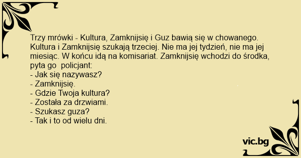 Trzy mrówki - Kultura, Zamknijsię i Guz bawią się w chowanego. Kultura i Zamknijsię szukają trzeciej. Nie ma jej tydzień, nie ma jej miesiąc. W końcu idą na komisariat. Zamknijsię wchodzi do środka, pyta go policjant: